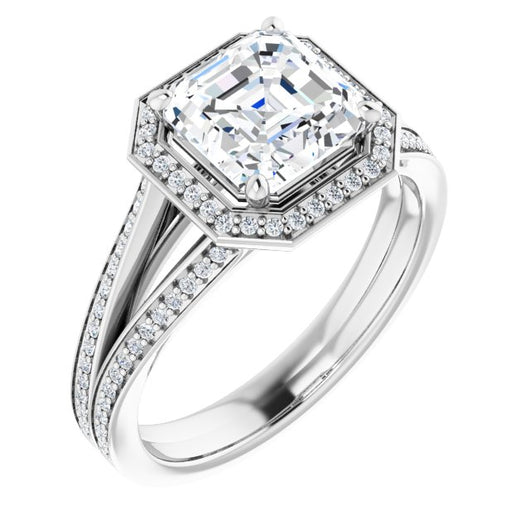 10K White Gold Customizable Asscher Cut Design with Split-Band Shared Prong & Halo