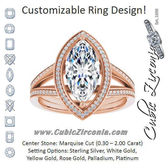 Cubic Zirconia Engagement Ring- The Carrie (Customizable Marquise Cut Design with Split-Band Shared Prong & Halo)