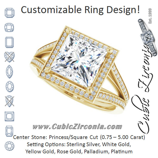 Cubic Zirconia Engagement Ring- The Carrie (Customizable Princess/Square Cut Design with Split-Band Shared Prong & Halo)