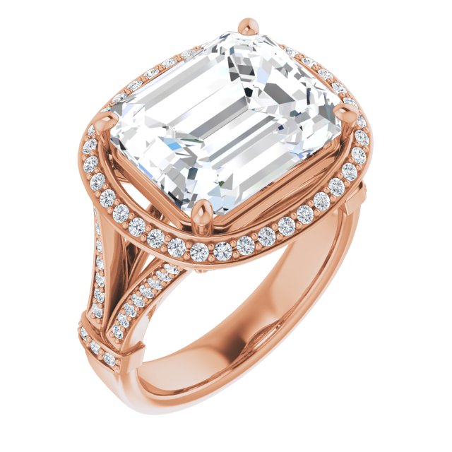 * Your ring’s total carat weight (TCW), band width, weight in grams, and/or number and size of accent, pavé, or halo stones will vary up or down depending on your choice of customizable center stone shape and size, precious metal type, and finger ring size via the drop-down options provided.
