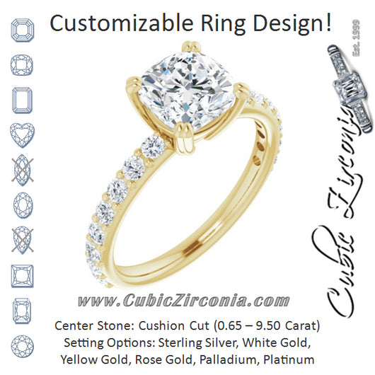 Center Stone Shape: Cushion Cut (as pictured). See this customizable ring set with other available center stone shapes here: customize setting.