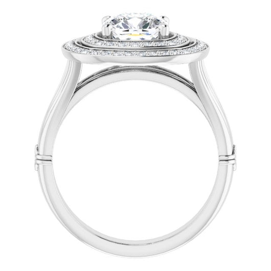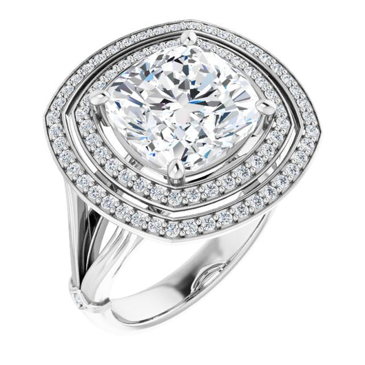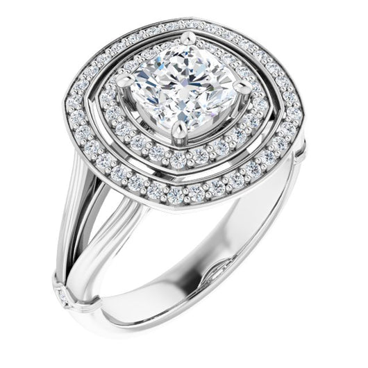 10K White Gold Customizable Cathedral-set Cushion Cut Design with Double Halo, Wide Split Band and Side Knuckle Accents