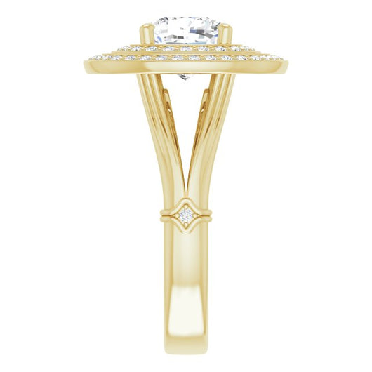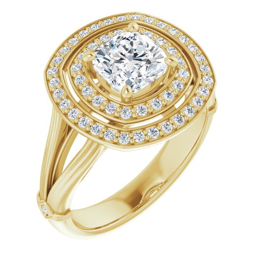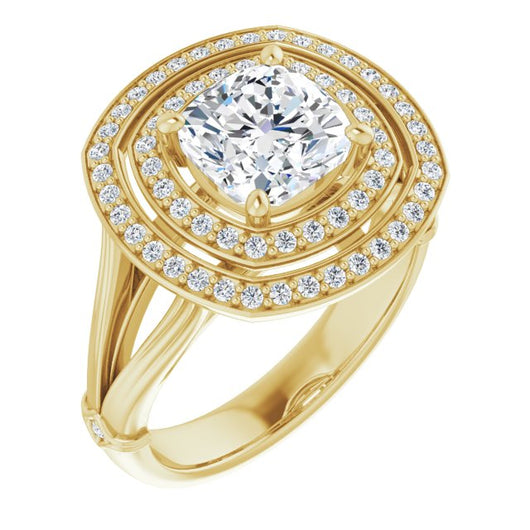 10K Yellow Gold Customizable Cathedral-set Cushion Cut Design with Double Halo, Wide Split Band and Side Knuckle Accents