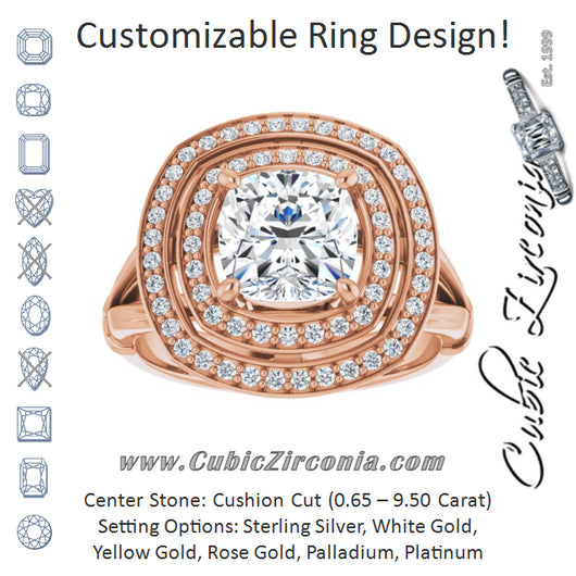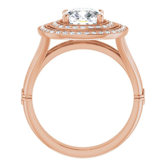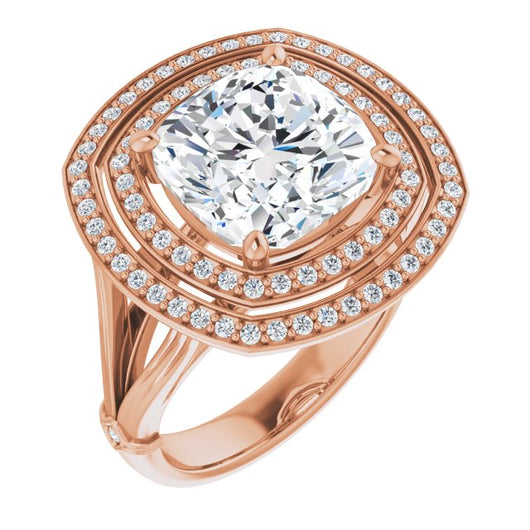 10K Rose Gold Customizable Cathedral-set Cushion Cut Design with Double Halo, Wide Split Band and Side Knuckle Accents