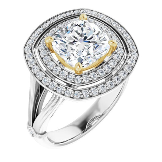 14K White & Yellow Gold Customizable Cathedral-set Cushion Cut Design with Double Halo, Wide Split Band and Side Knuckle Accents