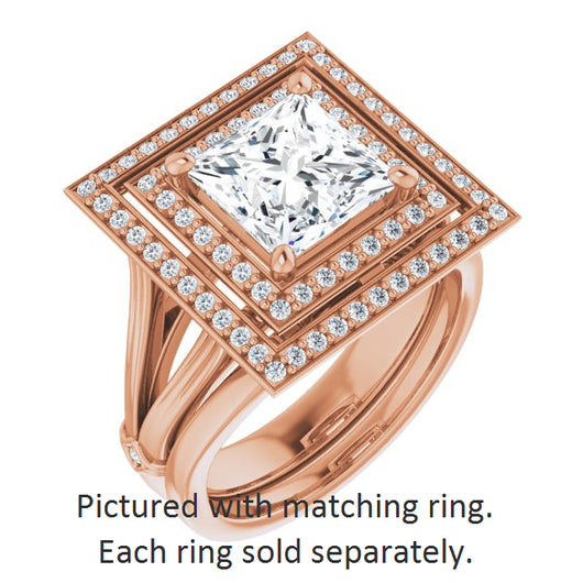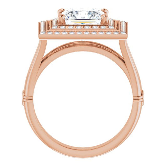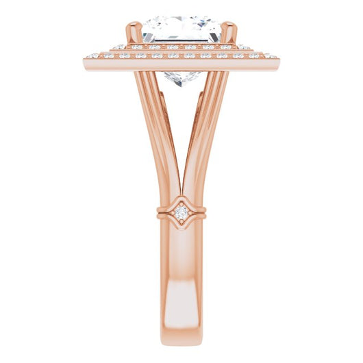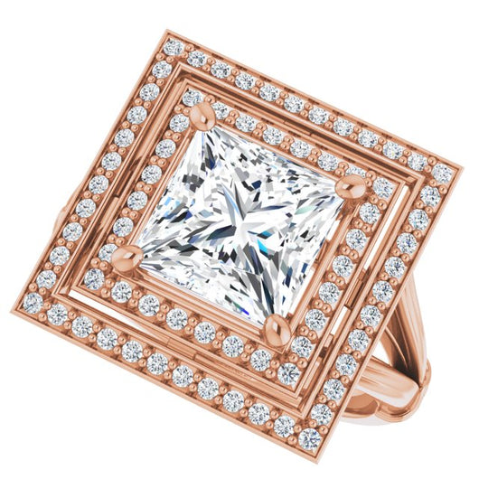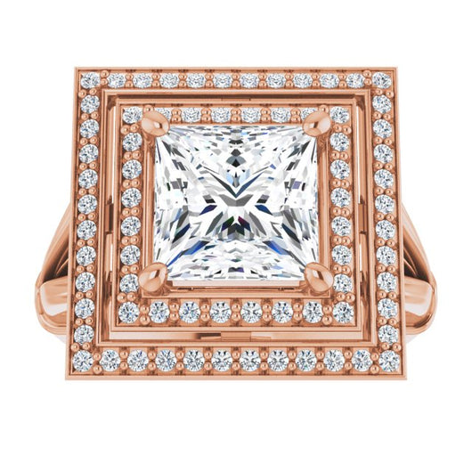 10K Rose Gold Customizable Cathedral-set Princess/Square Cut Design with Double Halo, Wide Split Band and Side Knuckle Accents
