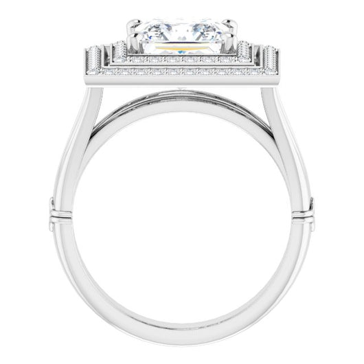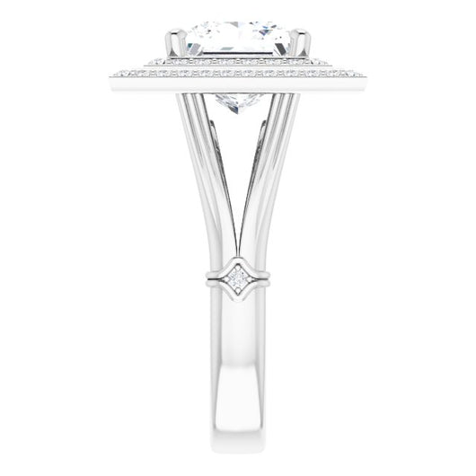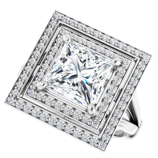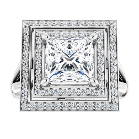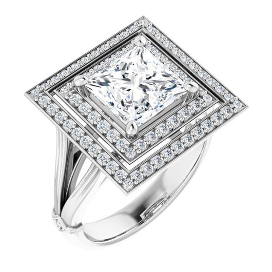 10K White Gold Customizable Cathedral-set Princess/Square Cut Design with Double Halo, Wide Split Band and Side Knuckle Accents