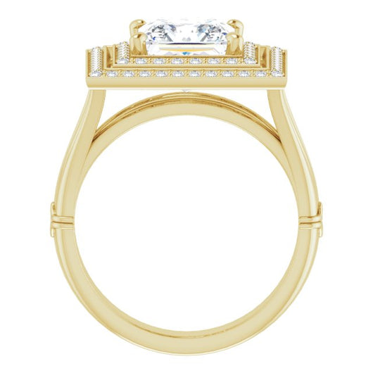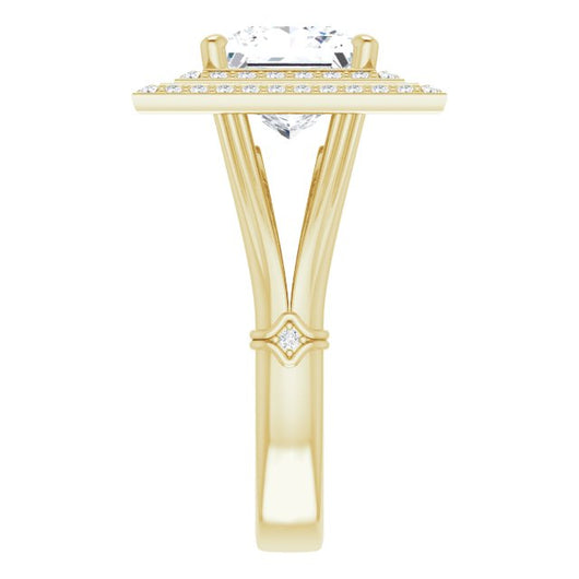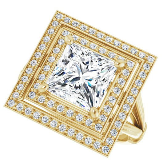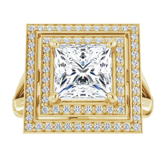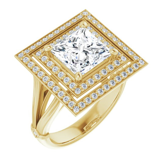 10K Yellow Gold Customizable Cathedral-set Princess/Square Cut Design with Double Halo, Wide Split Band and Side Knuckle Accents