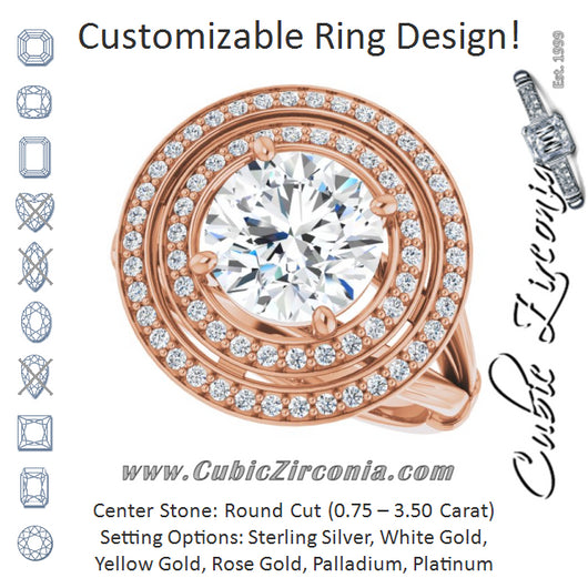 Cubic Zirconia Engagement Ring- The Cheryl (Customizable Cathedral-set Round Cut Design with Double Halo, Wide Split Band and Side Knuckle Accents)