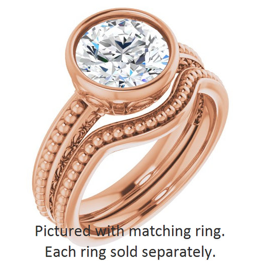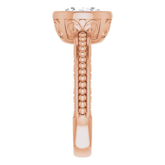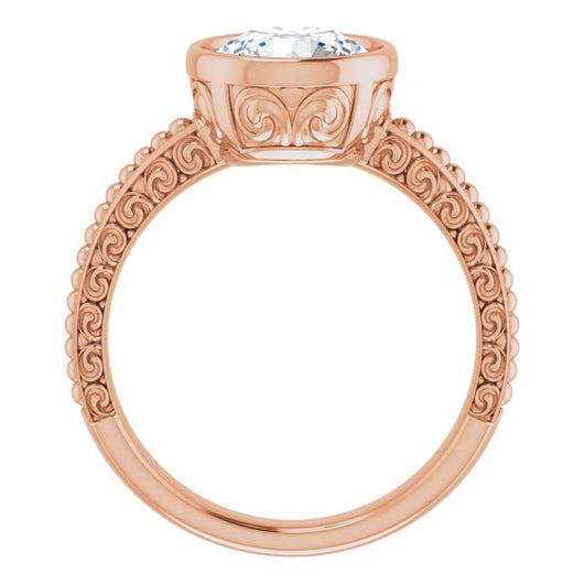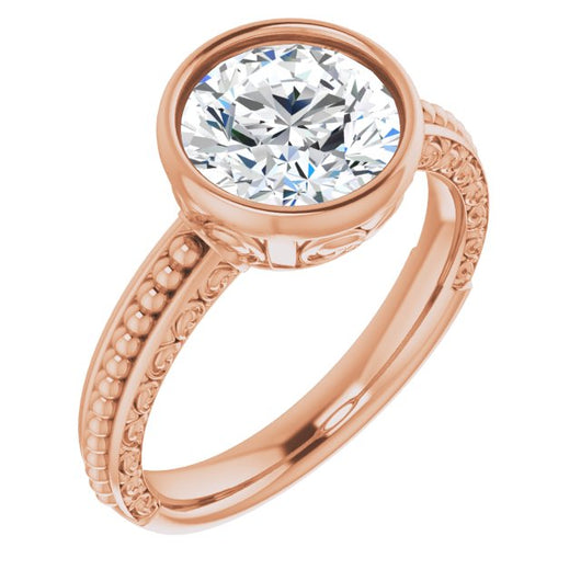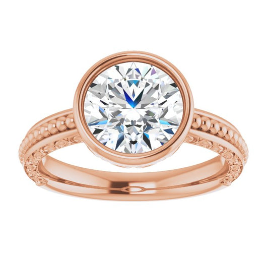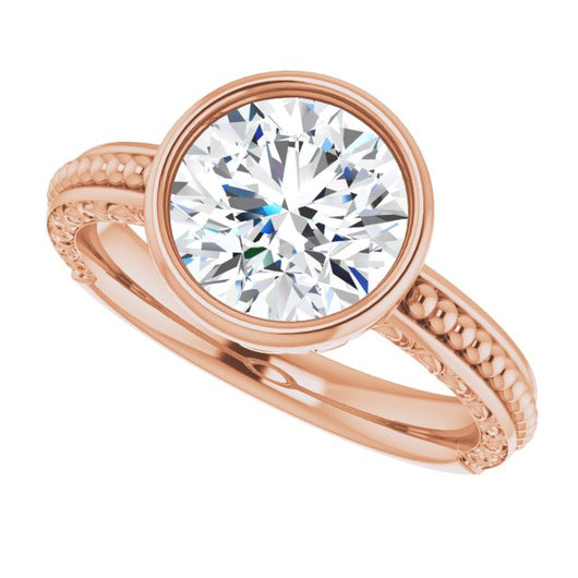14K Rose Gold Customizable Bezel-set Round Cut Solitaire with Beaded and Carved Three-sided Band