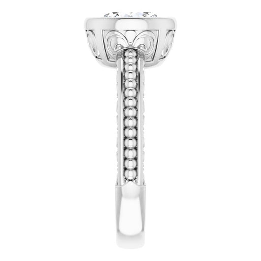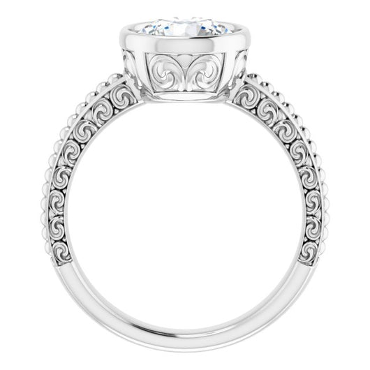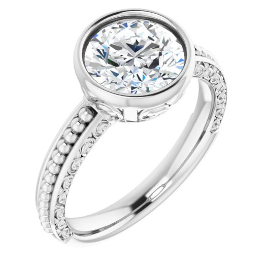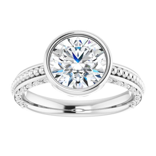 14K White Gold Customizable Bezel-set Round Cut Solitaire with Beaded and Carved Three-sided Band