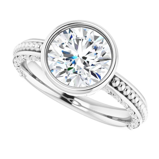 10K White Gold Customizable Bezel-set Round Cut Solitaire with Beaded and Carved Three-sided Band