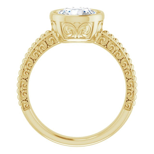 14K Yellow Gold Customizable Bezel-set Round Cut Solitaire with Beaded and Carved Three-sided Band