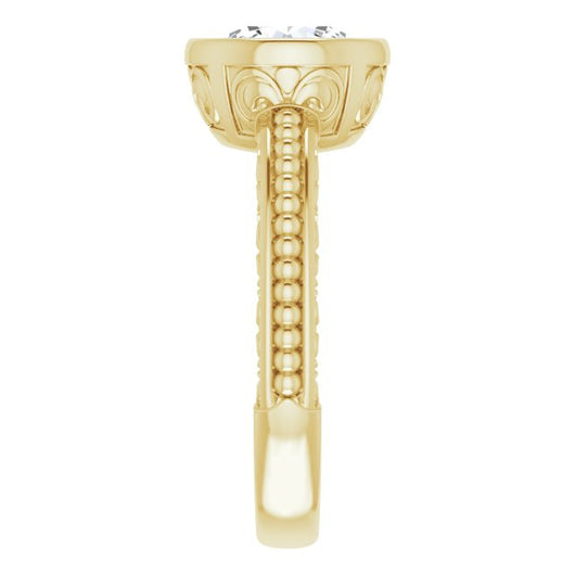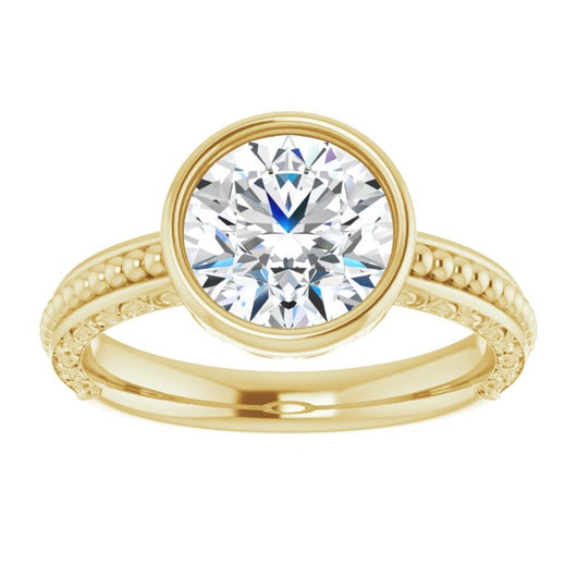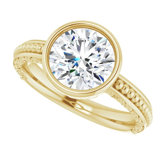 18K Yellow Gold Customizable Bezel-set Round Cut Solitaire with Beaded and Carved Three-sided Band