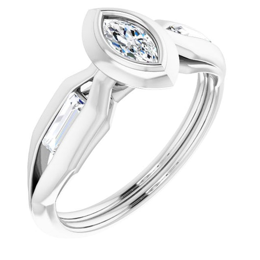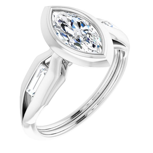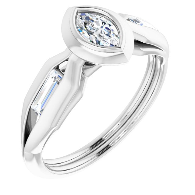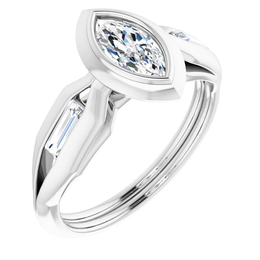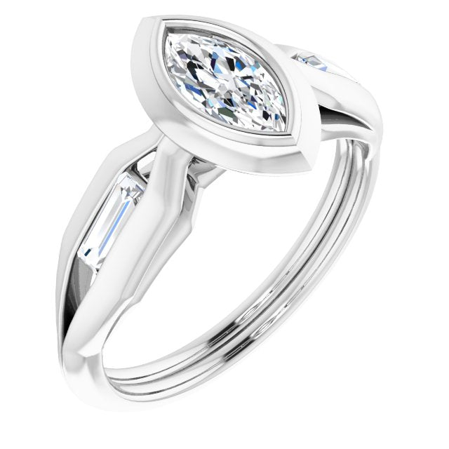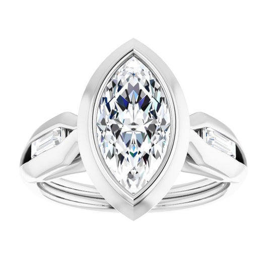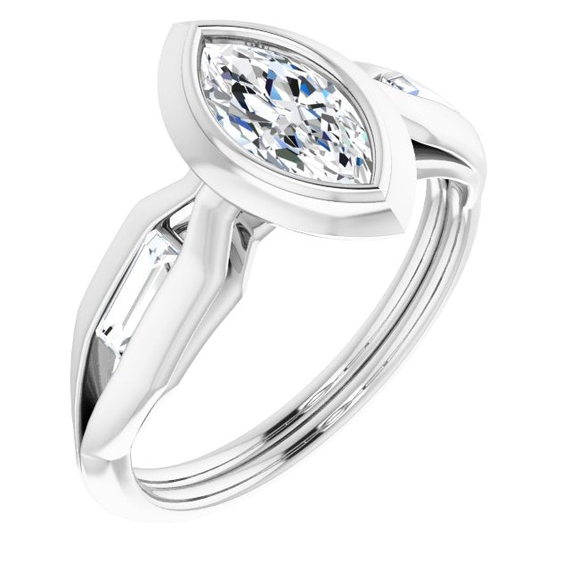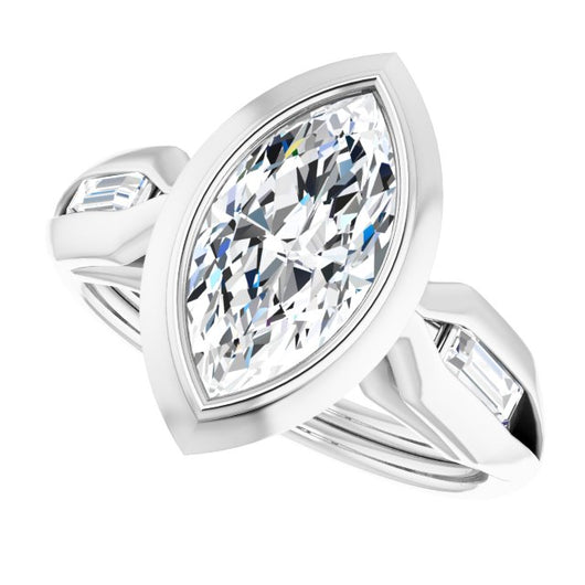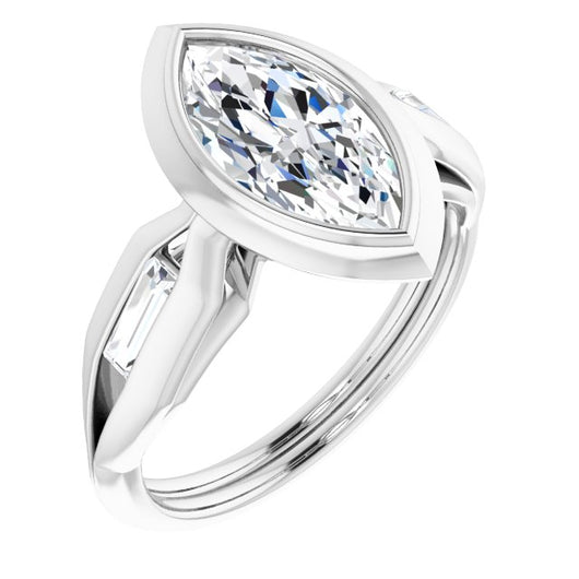 10K White Gold Customizable Bezel-set Marquise Cut Design with Wide Split Band & Tension-Channel Baguette Accents