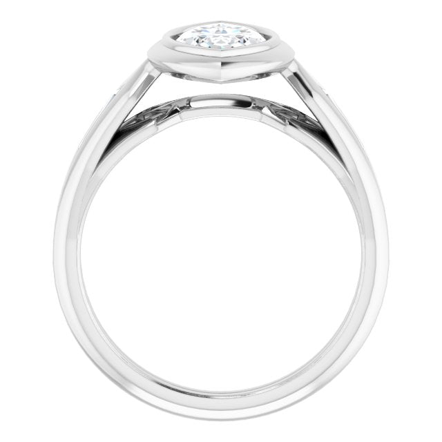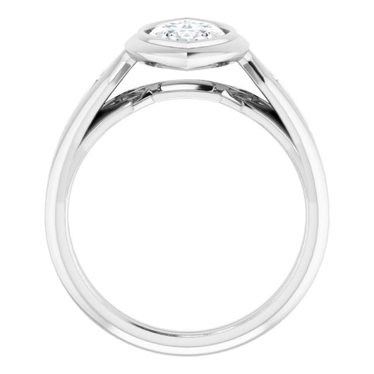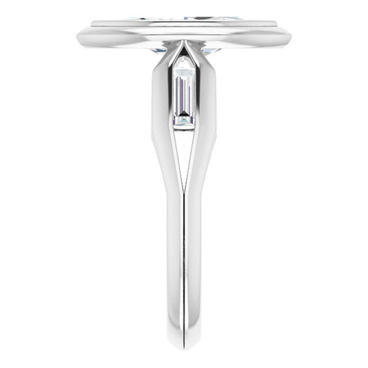 But we don't judge anyone. First marriage or future marriage, love is love and deserves to be celebrated. And lifted up, just like the high-raised, cathedral-style, bezel-set Marquise Cut center stone sitting atop The Claudelle's tapered split-band crafted in any of 12 precious metals you choose. A channel-tension setting holds two (2) 5.00 x 2.00 mm* straight baguette accents-- one accent on each side of the band.