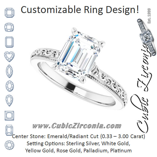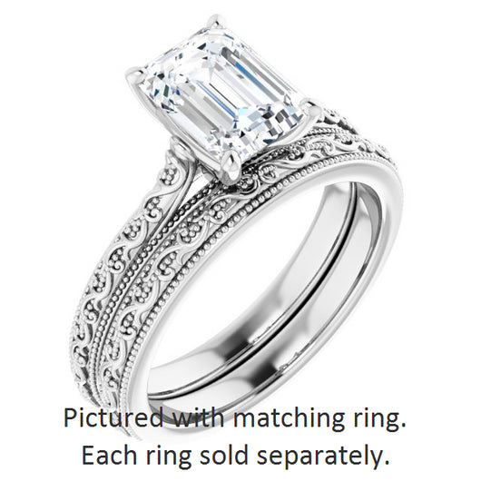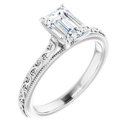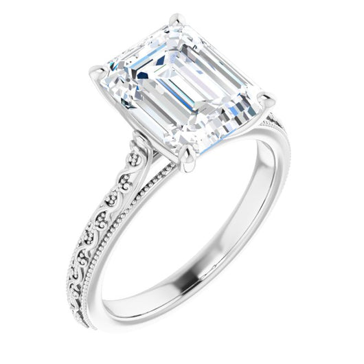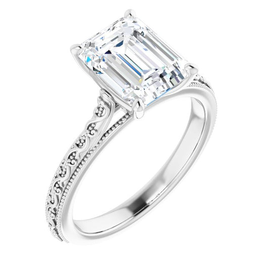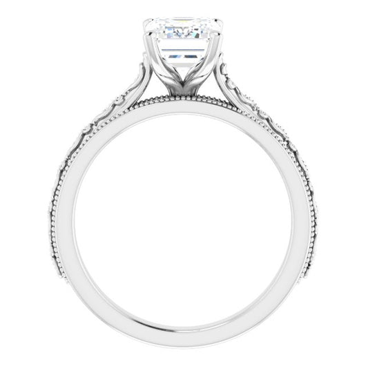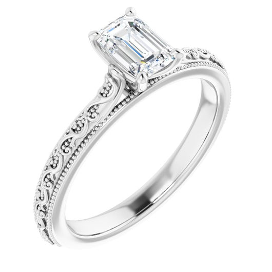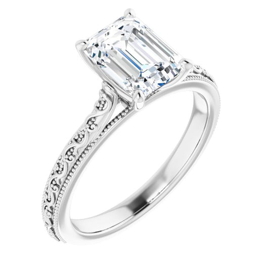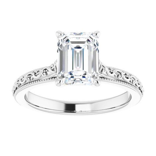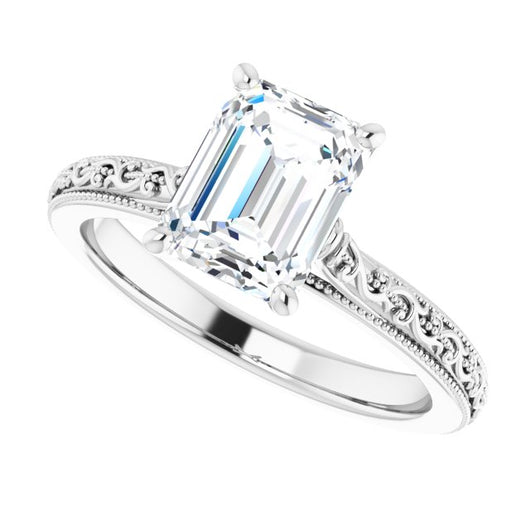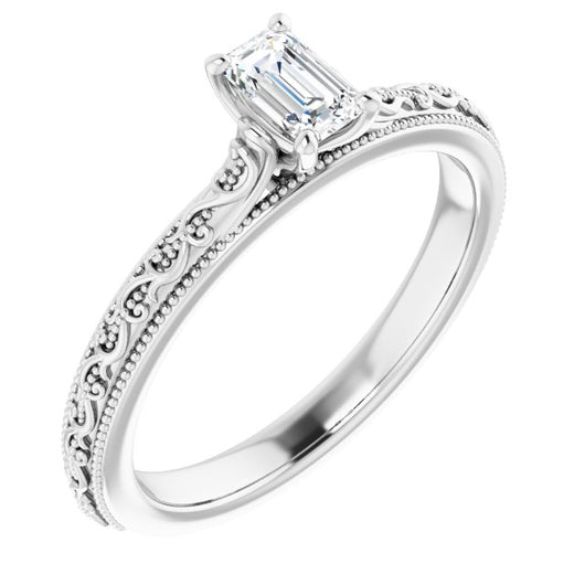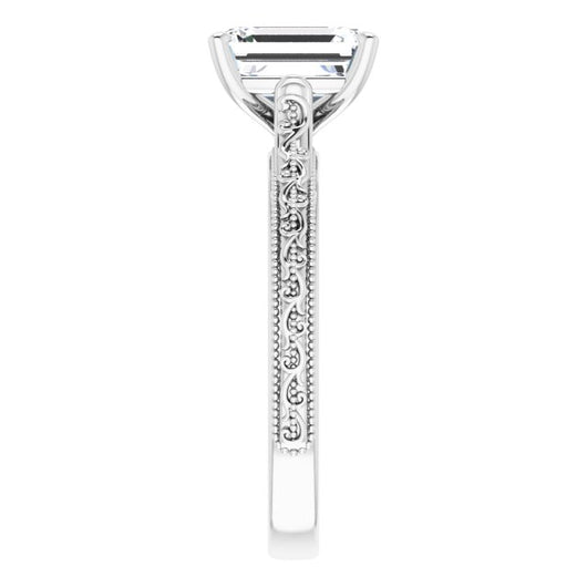 10K White Gold Customizable Emerald/Radiant Cut Solitaire with Delicate Milgrain Filigree Band