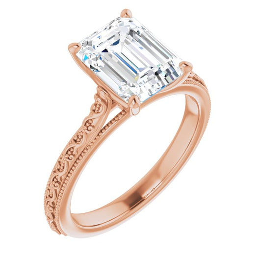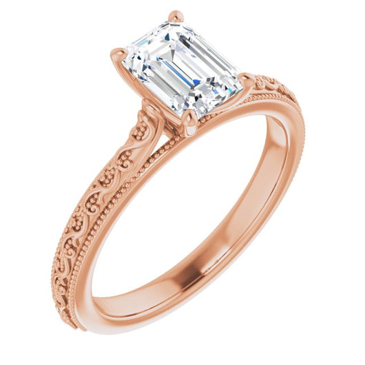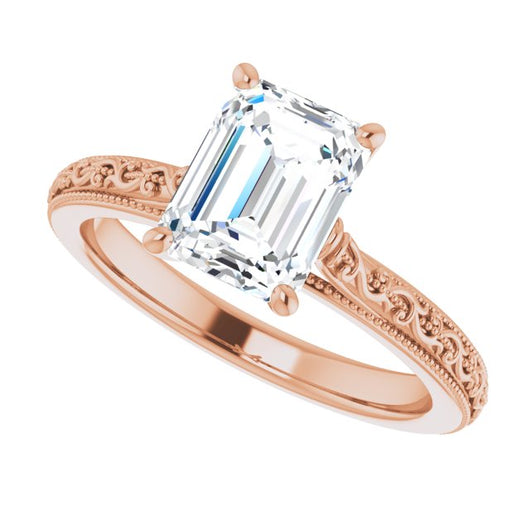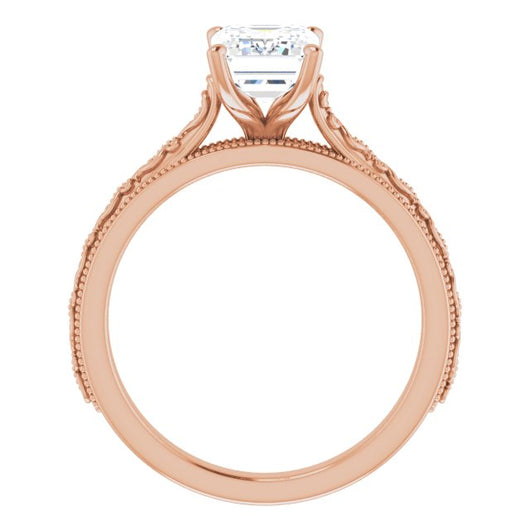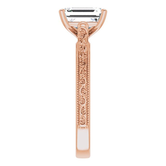 10K Rose Gold Customizable Emerald/Radiant Cut Solitaire with Delicate Milgrain Filigree Band