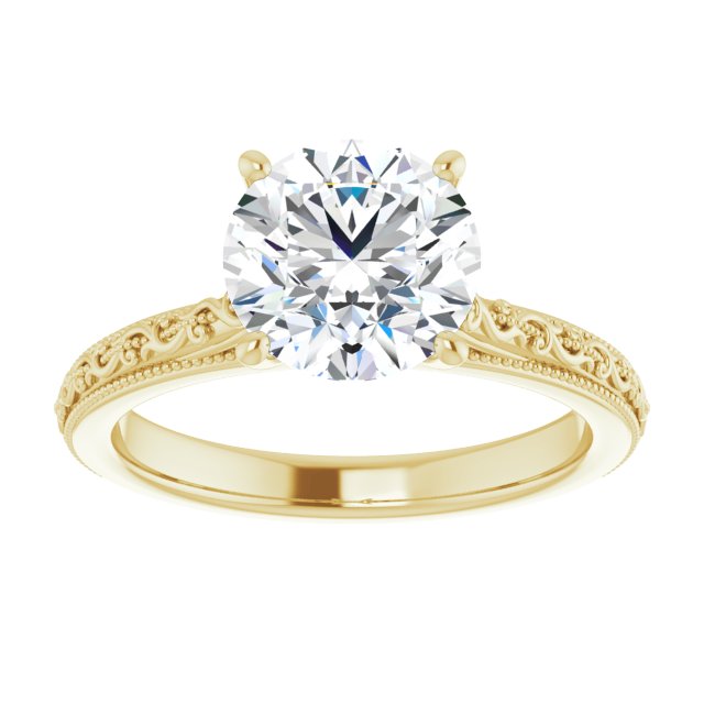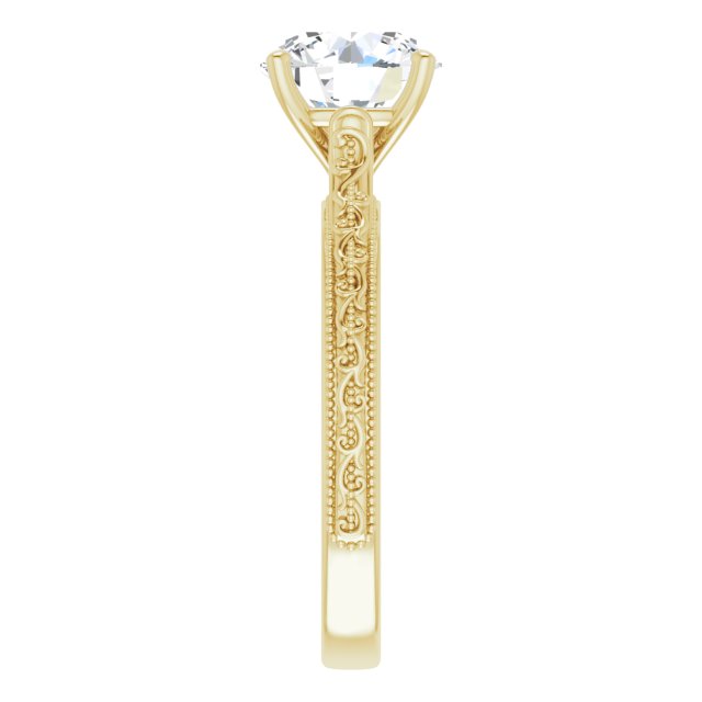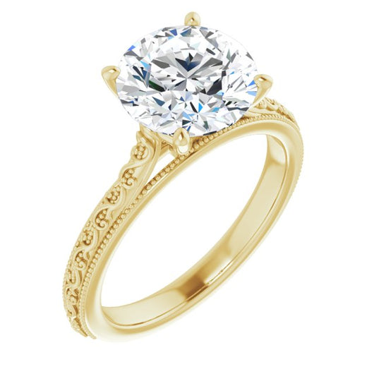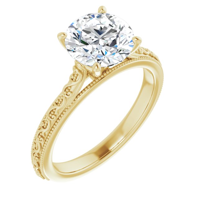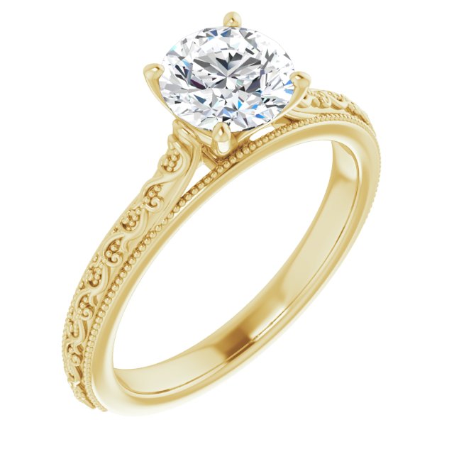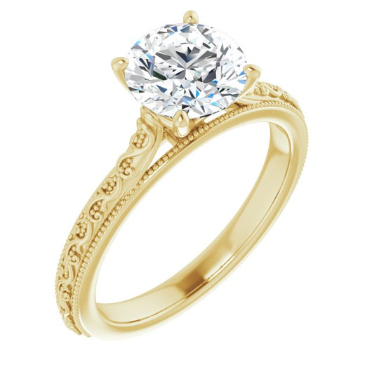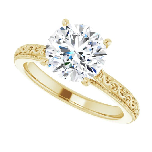 14K Yellow Gold Customizable Round Cut Solitaire with Delicate Milgrain Filigree Band