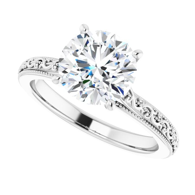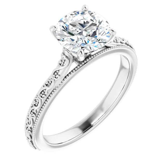 18K White Gold Customizable Round Cut Solitaire with Delicate Milgrain Filigree Band