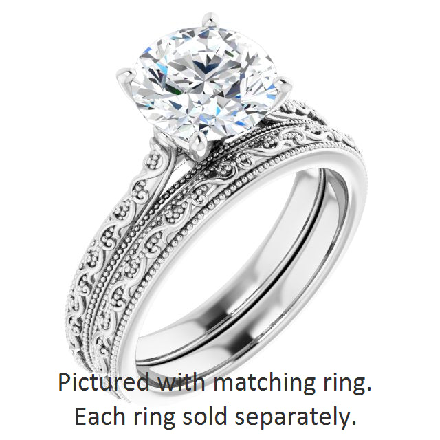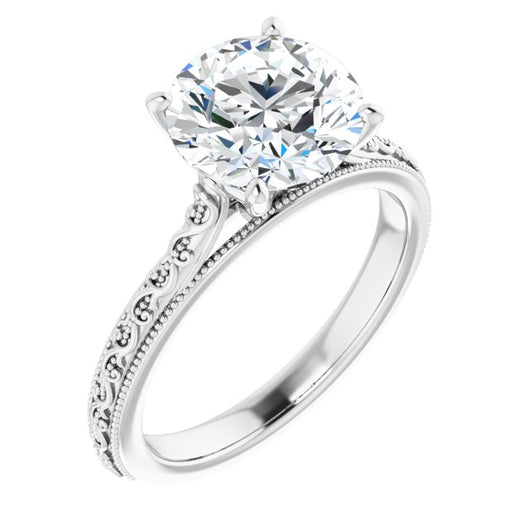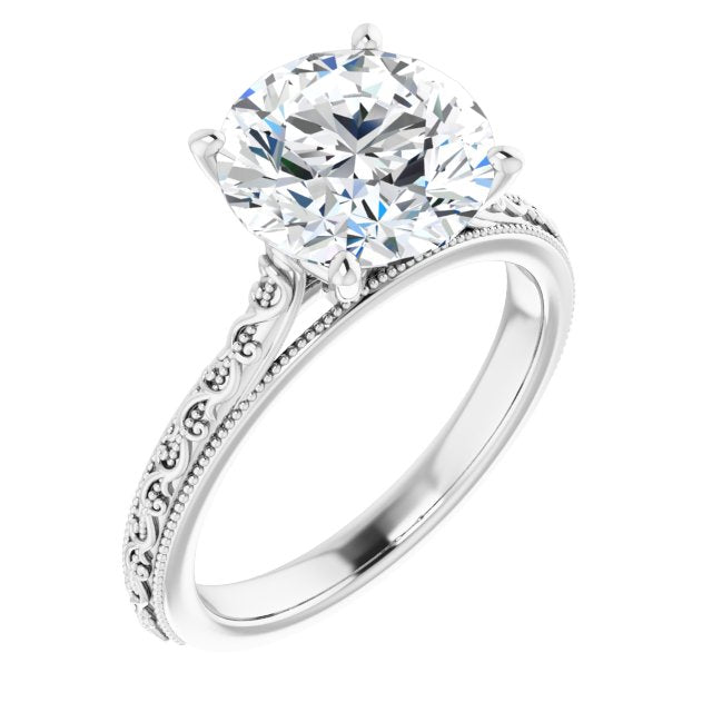 10K White Gold Customizable Round Cut Solitaire with Delicate Milgrain Filigree Band