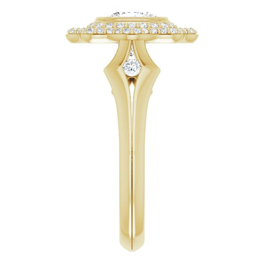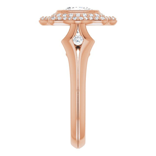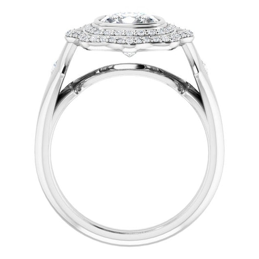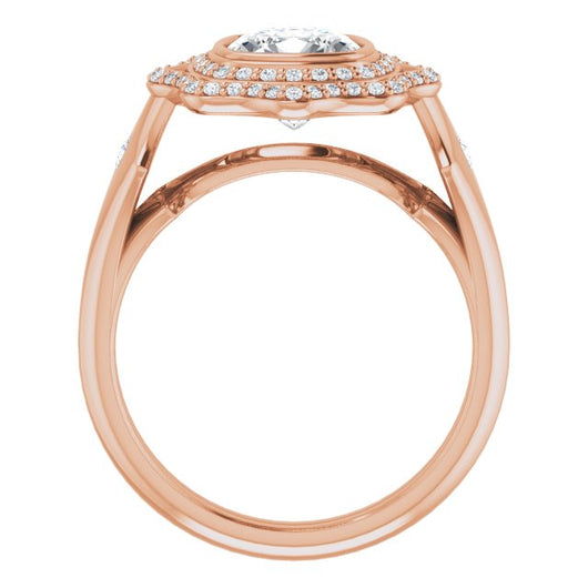 * Your ring’s total carat weight (TCW), band width, weight in grams, and/or number and size of accent, pavé, or halo stones will vary up or down depending on your choice of customizable center stone shape and size, precious metal type, and finger ring size via the drop-down options provided.