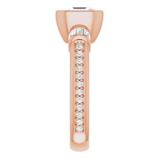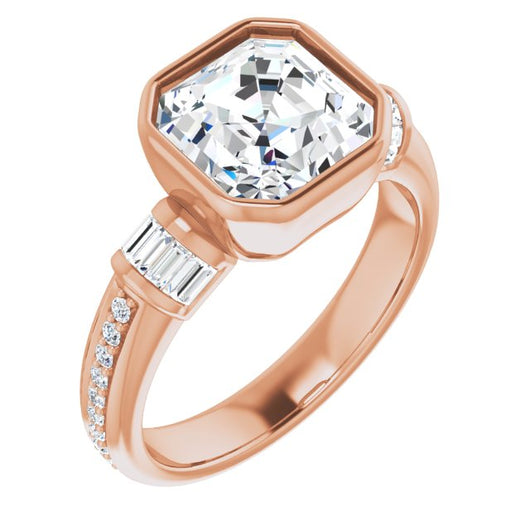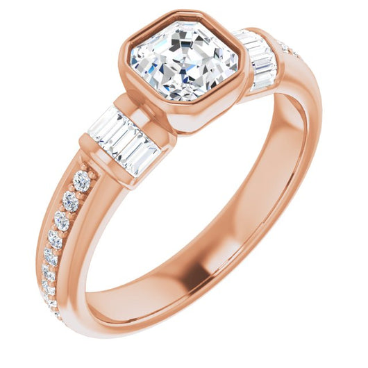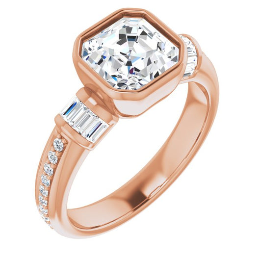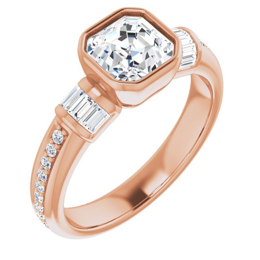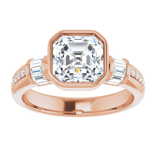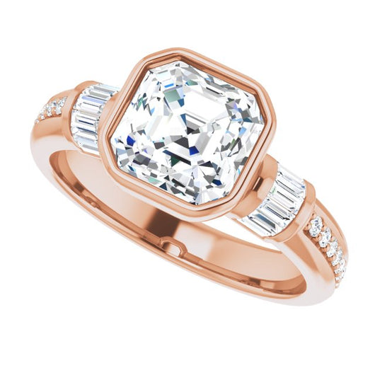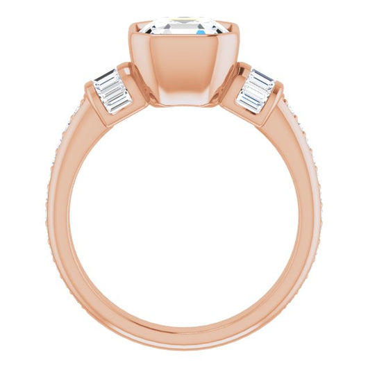 10K Rose Gold Customizable Cathedral-Bezel Asscher Cut Style with Horizontal Baguettes & Shared Prong Band