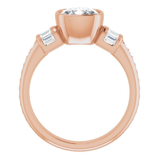 * Your ring’s total carat weight (TCW), band width, weight in grams, and/or number and size of accent, pavé, or halo stones will vary up or down depending on your choice of customizable center stone shape and size, precious metal type, and finger ring size via the drop-down options provided.