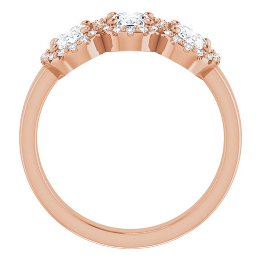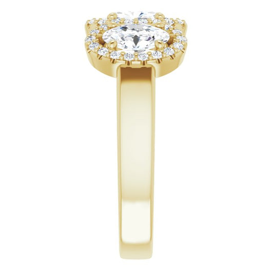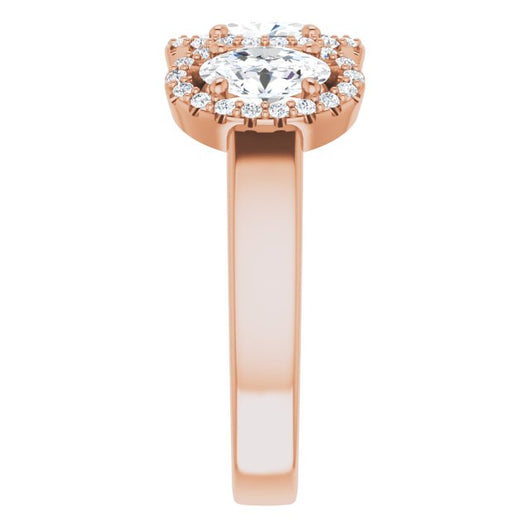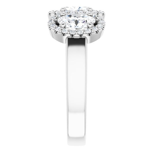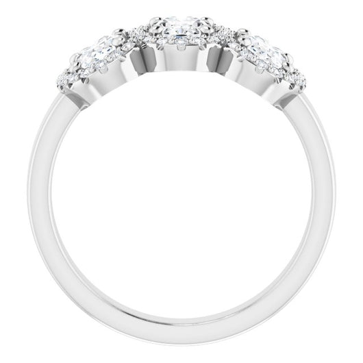 Honor her with this triple-halo-style engagement ring available exclusively from CubicZirconia.com. You can even choose the precious metal that will make her heart sing for your love. The round prong side stones making up the halo give a finished look, that draws attention to the triple center stones without being too showy. This is the perfect engagement ring for the perfect start to a life together of strength, trust, and perseverance, no matter what life throws your way. Of course there will be great times, too. Together, you'll make sure of that.