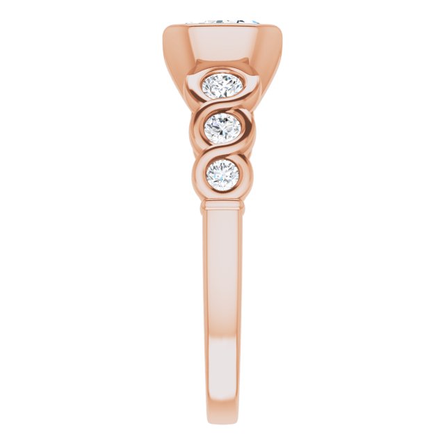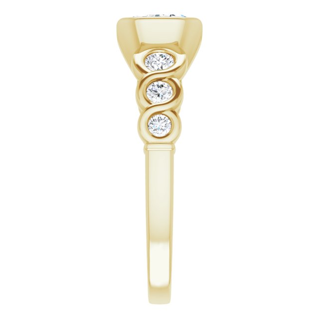 * Your ring’s total carat weight (TCW), band width, weight in grams, and/or number and size of accent, pavé, or halo stones will vary up or down depending on your choice of customizable center stone shape and size, precious metal type, and finger ring size via the drop-down options provided.