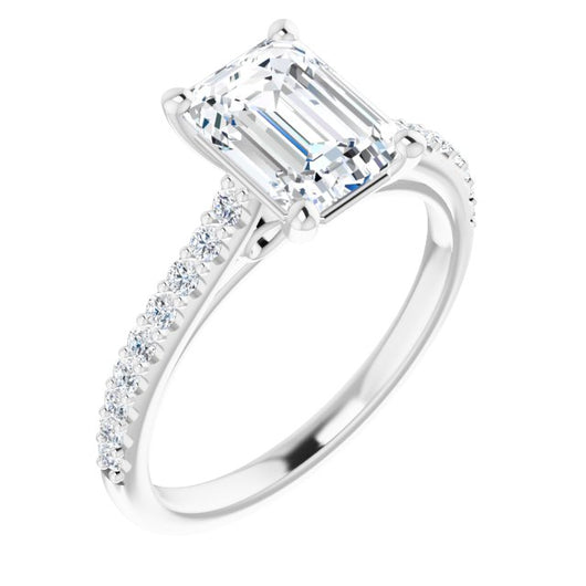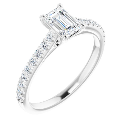 Center Stone Shape: Radiant Cut (as pictured with Emerald Cut). See this customizable ring set with other available center stone shapes here: customize setting.
