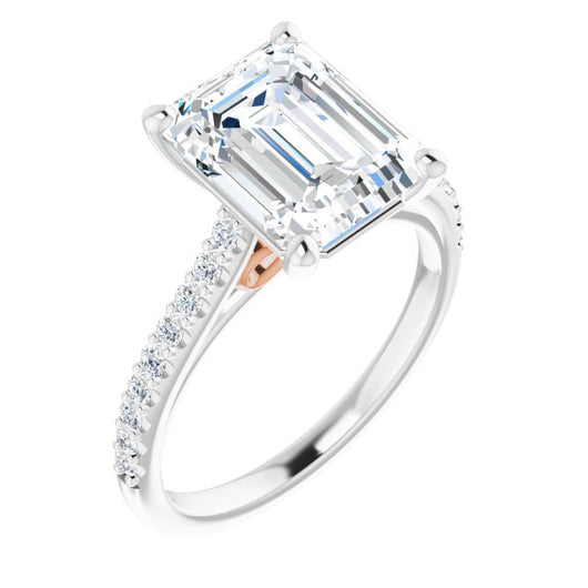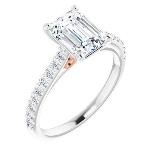 14K Rose & White Gold Customizable Cathedral-raised Emerald/Radiant Cut Design with Accented Band and Infinity Symbol Trellis Decoration