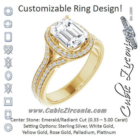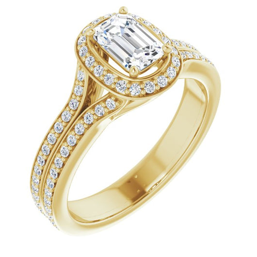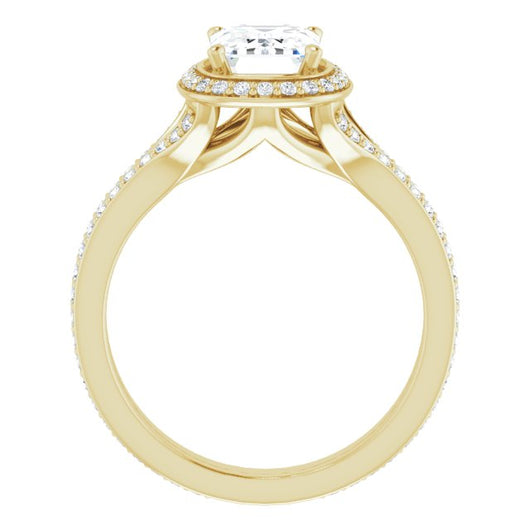 10K Yellow Gold Customizable Cathedral-raised Emerald/Radiant Cut Setting with Halo and Shared Prong Band