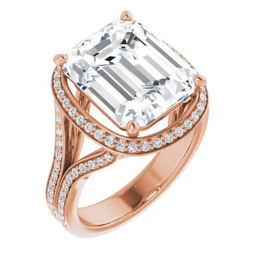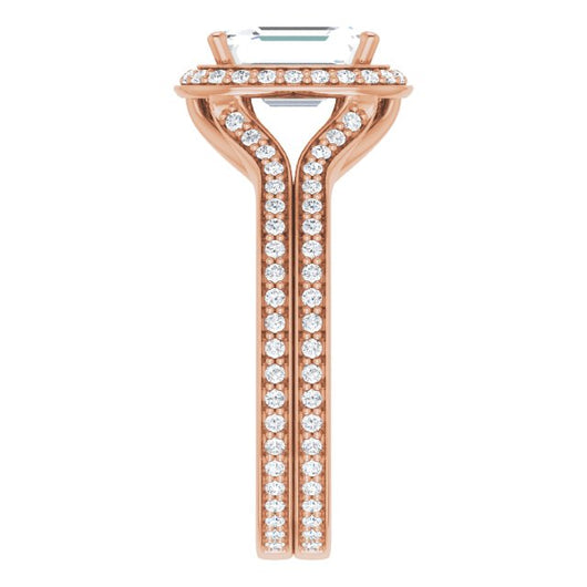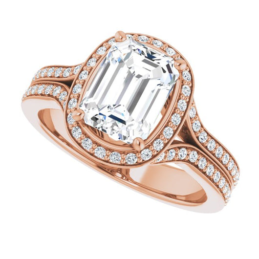 10K Rose Gold Customizable Cathedral-raised Emerald/Radiant Cut Setting with Halo and Shared Prong Band