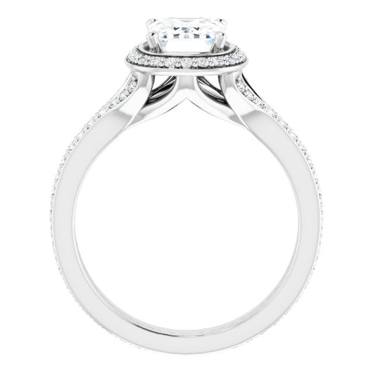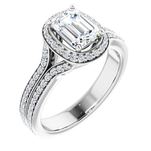 10K White Gold Customizable Cathedral-raised Emerald/Radiant Cut Setting with Halo and Shared Prong Band