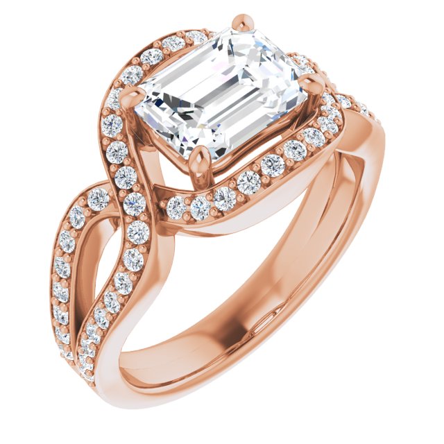 10K Rose Gold Customizable Emerald/Radiant Cut Center with Infinity-inspired Split Shared Prong Band and Bypass Halo