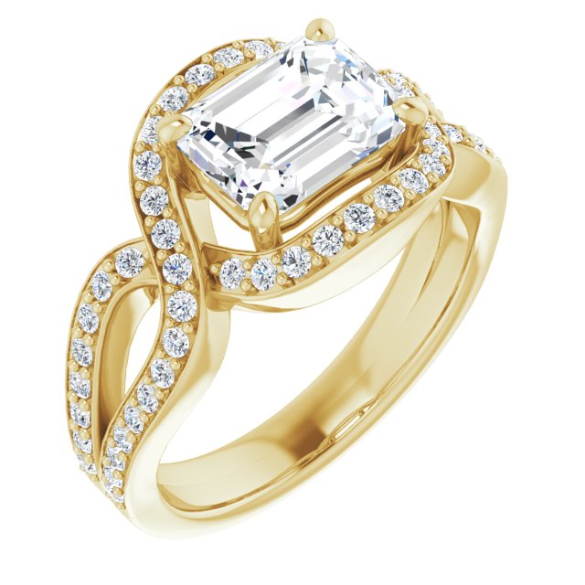 10K Yellow Gold Customizable Emerald/Radiant Cut Center with Infinity-inspired Split Shared Prong Band and Bypass Halo