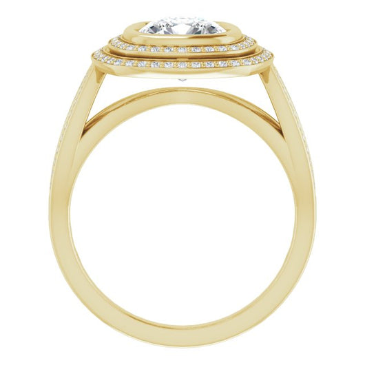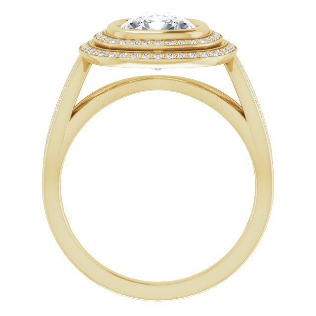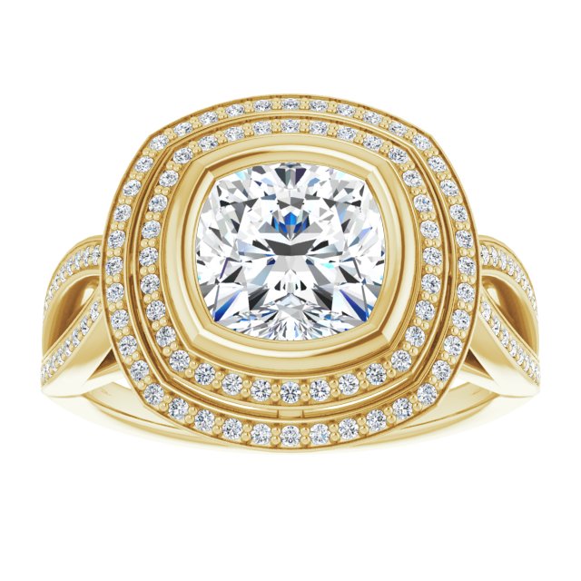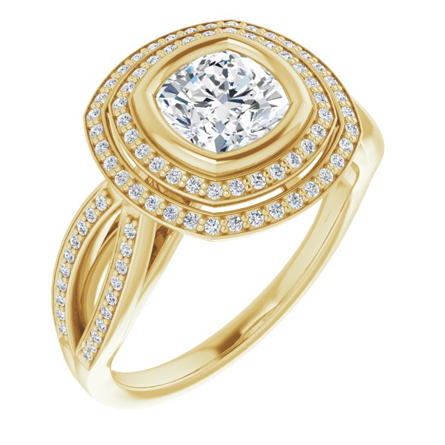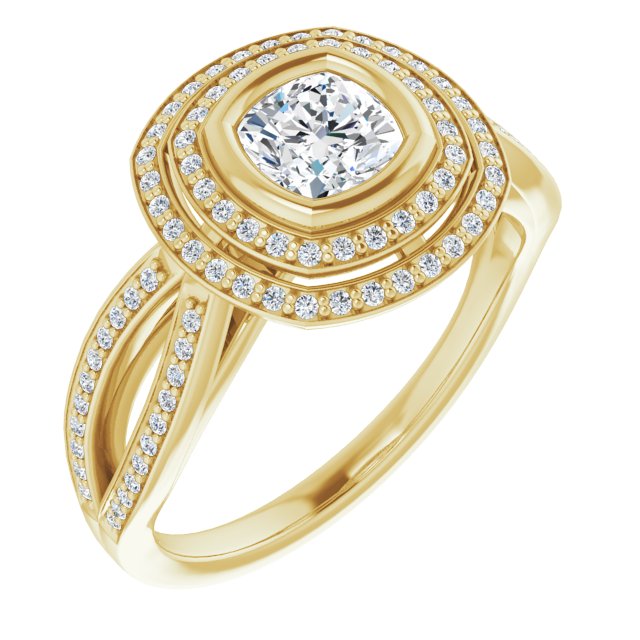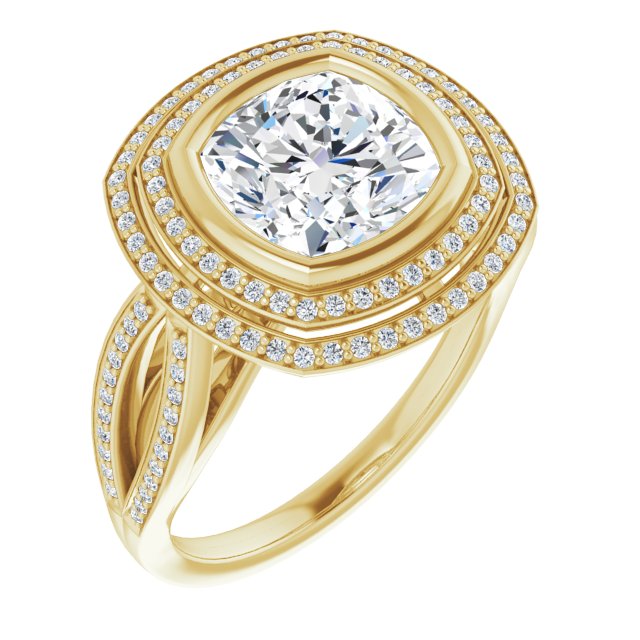 10K Yellow Gold Customizable Bezel-set Cushion Cut Style with Double Halo and Split Shared Prong Band