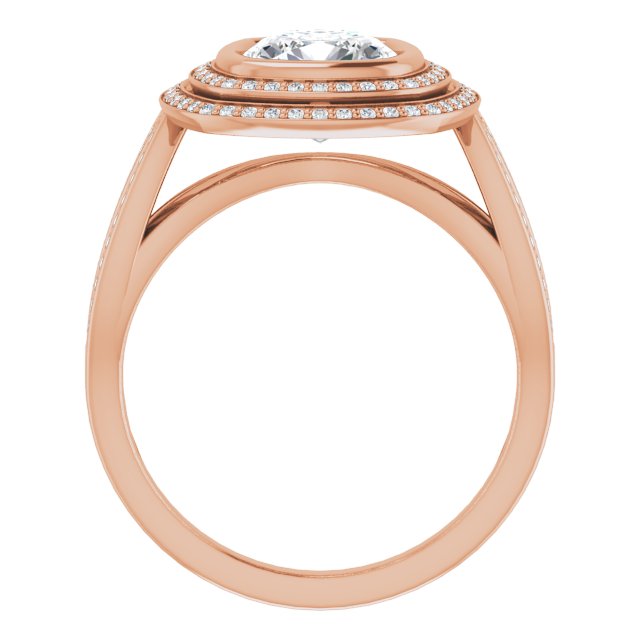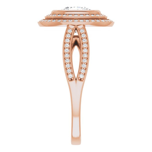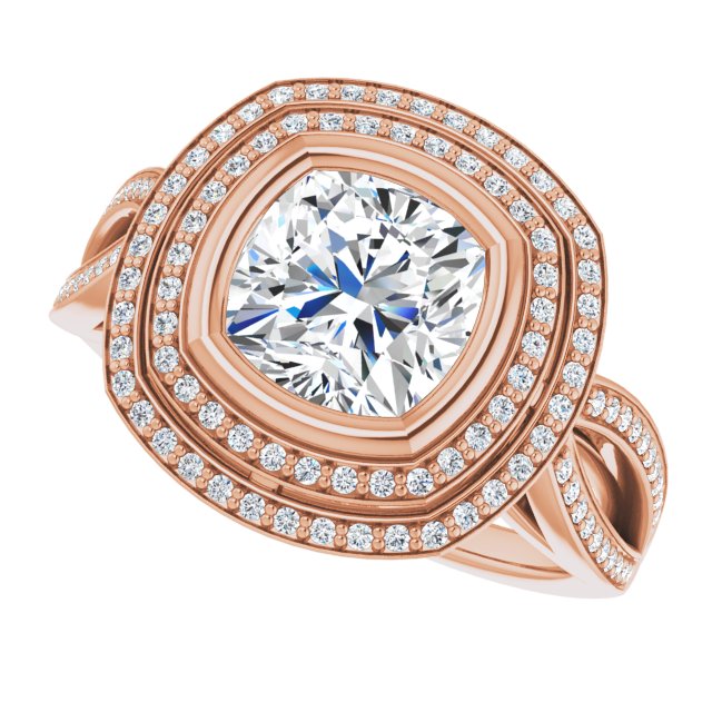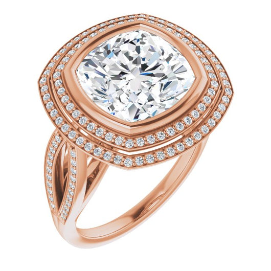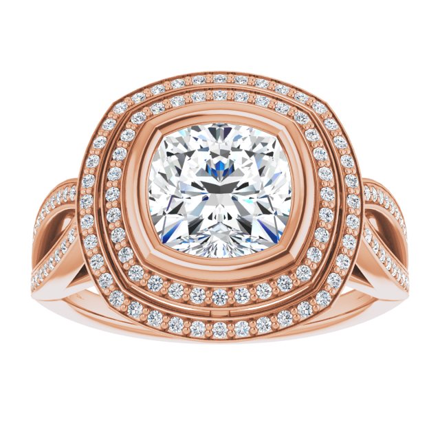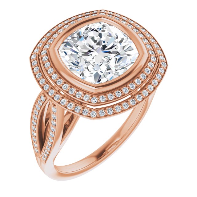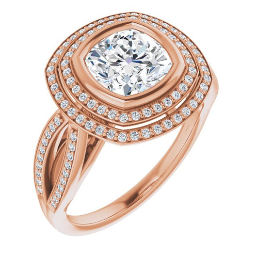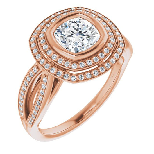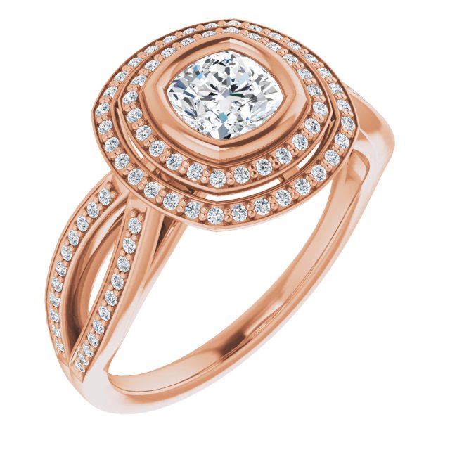 10K Rose Gold Customizable Bezel-set Cushion Cut Style with Double Halo and Split Shared Prong Band