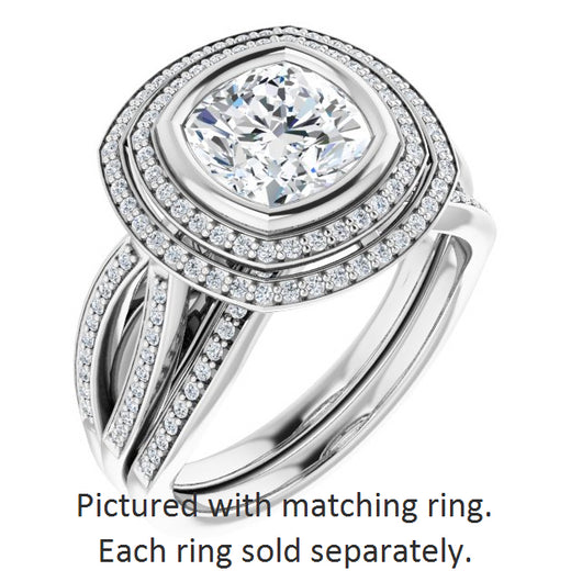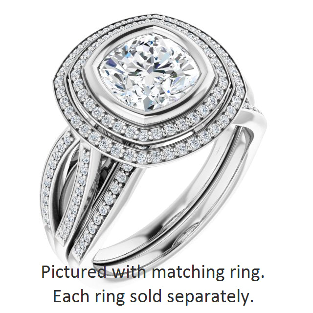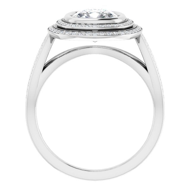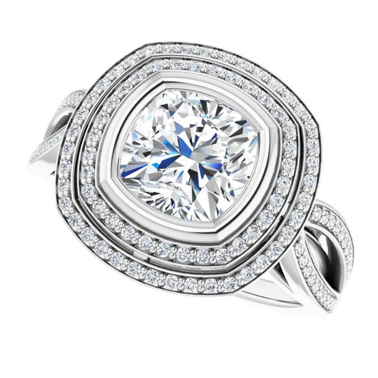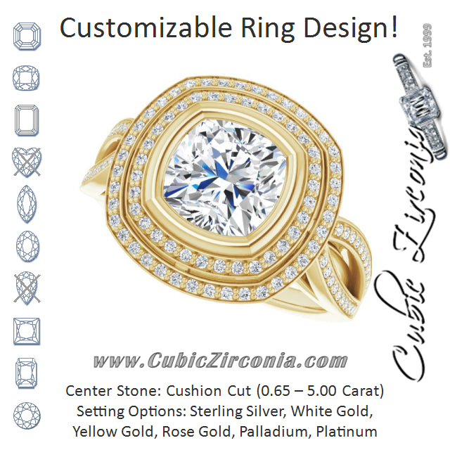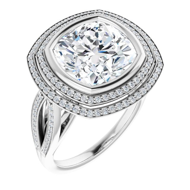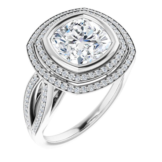 Cubic Zirconia Engagement Ring- The Eliana (Customizable Bezel-set Cushion Cut Style with Double Halo and Split Shared Prong Band)