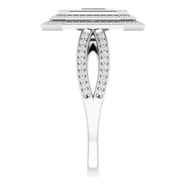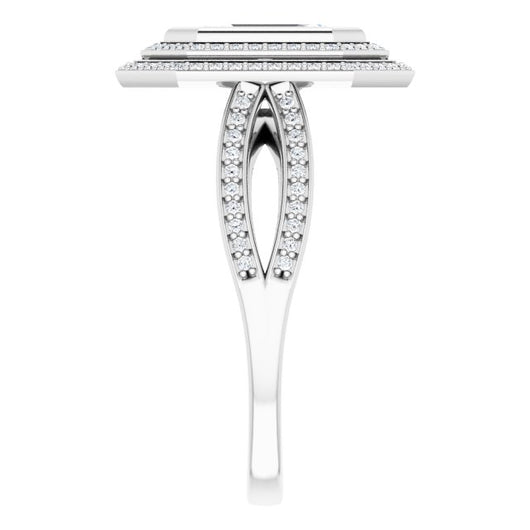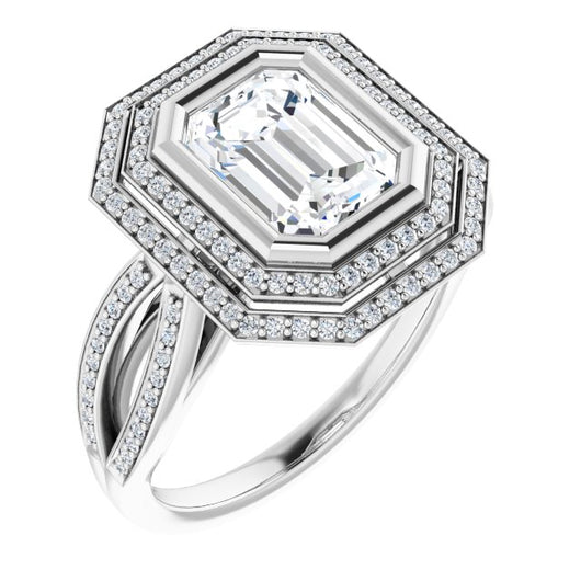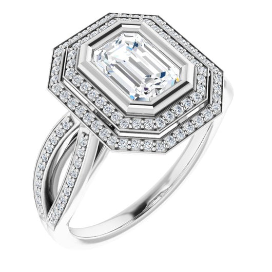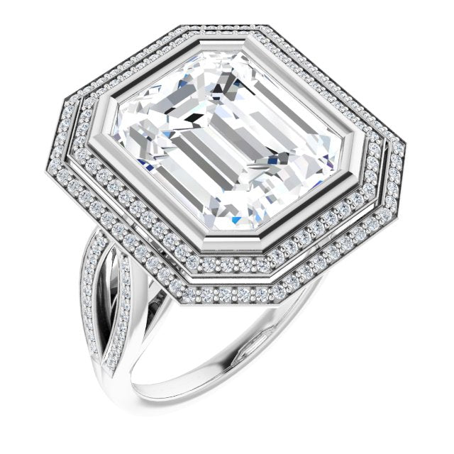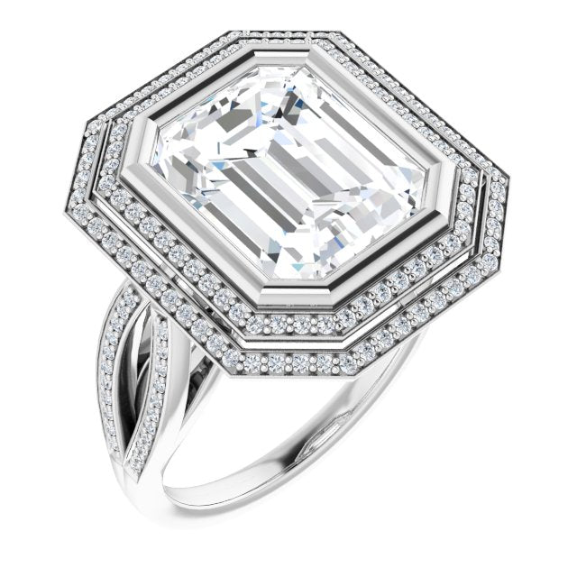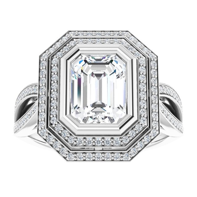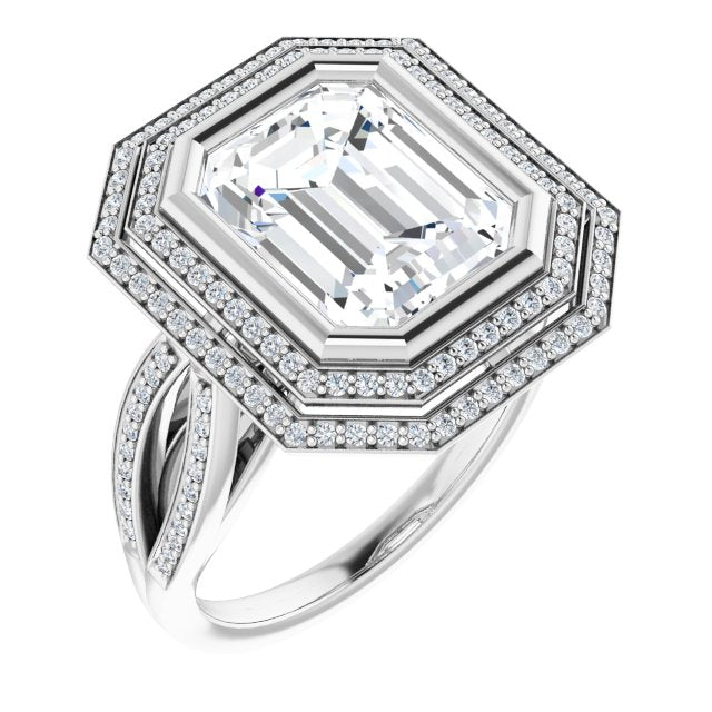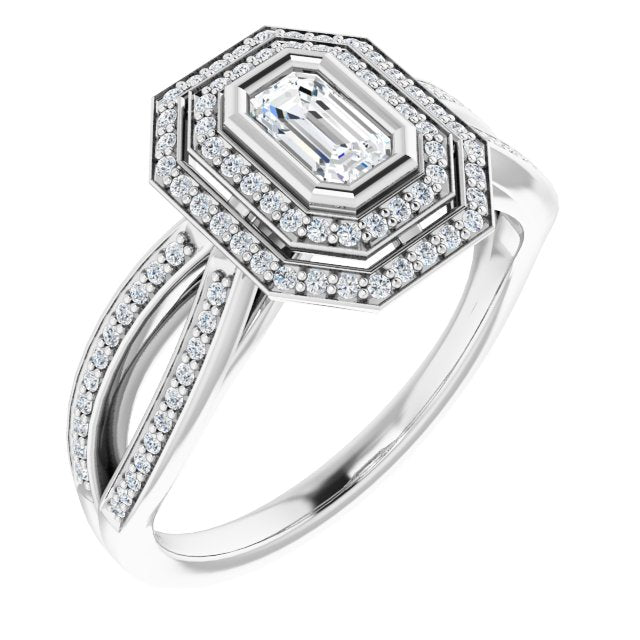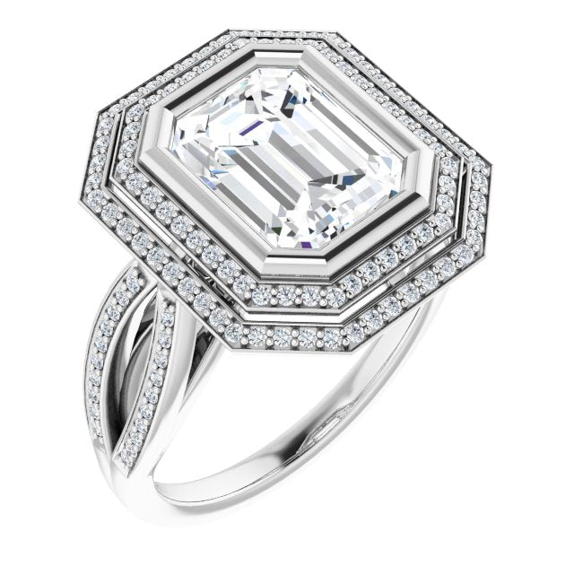 10K White Gold Customizable Bezel-set Emerald/Radiant Cut Style with Double Halo and Split Shared Prong Band