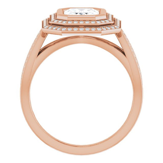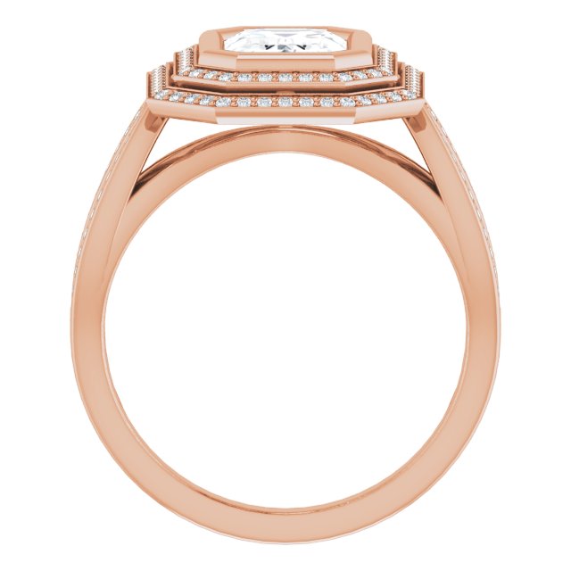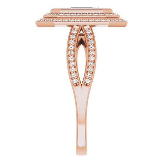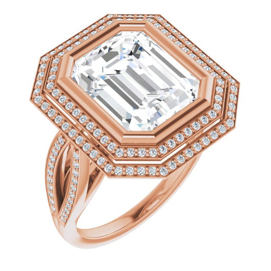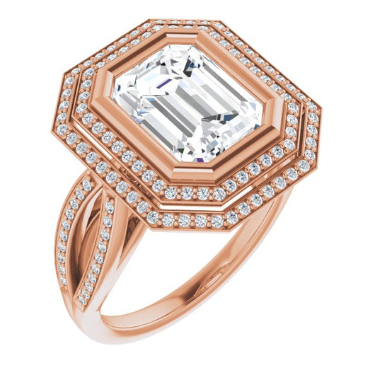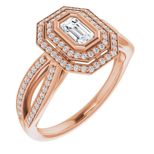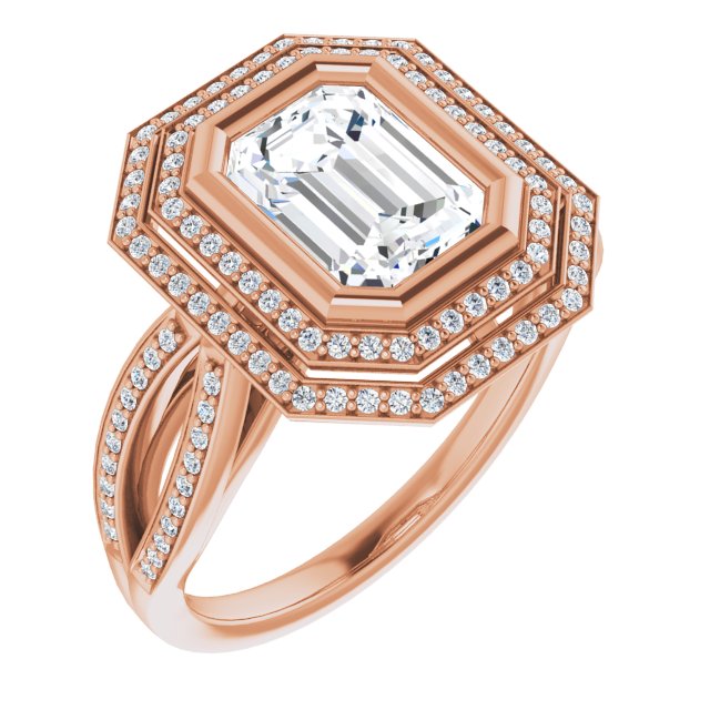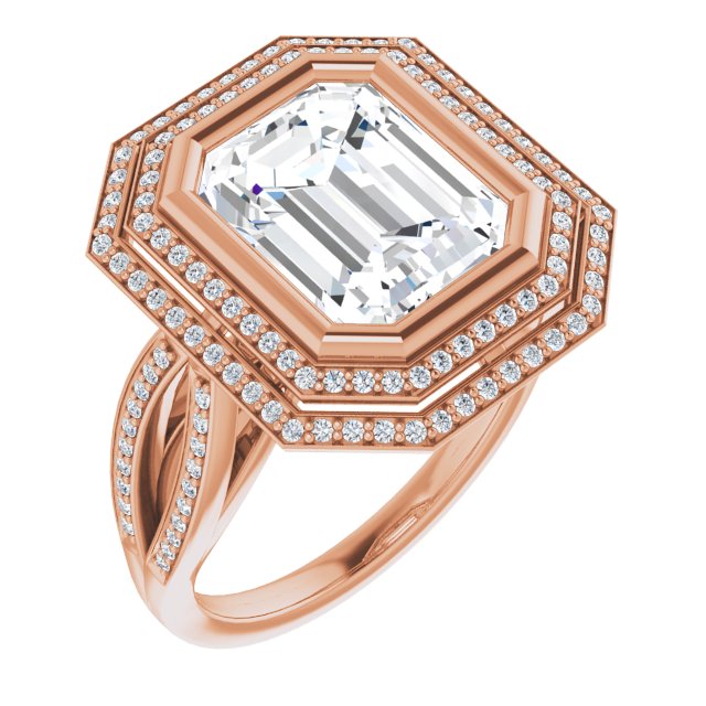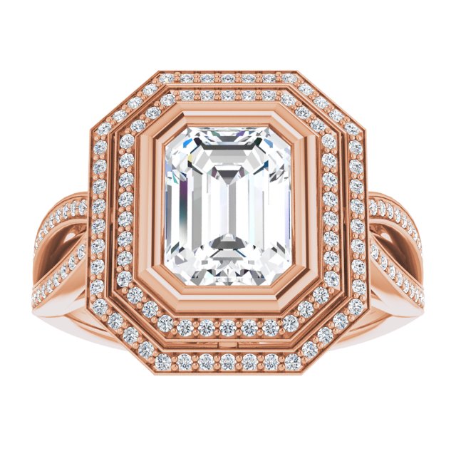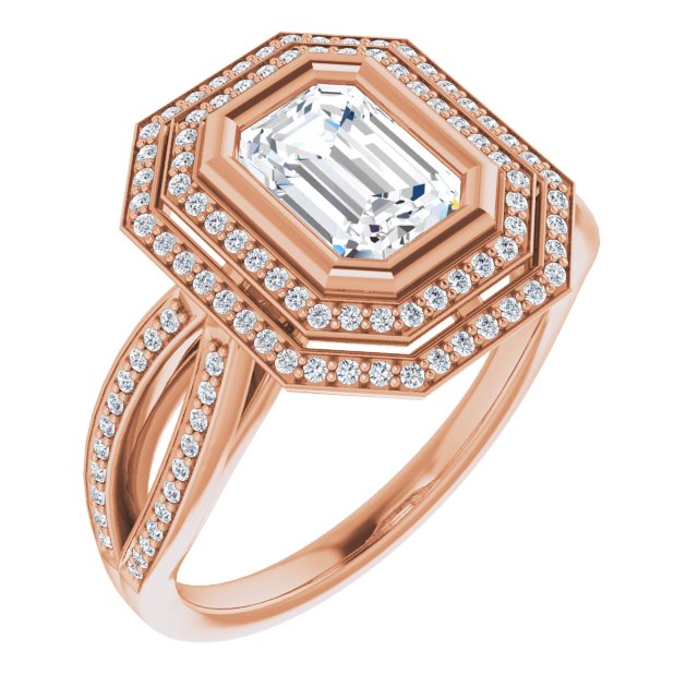 10K Rose Gold Customizable Bezel-set Emerald/Radiant Cut Style with Double Halo and Split Shared Prong Band