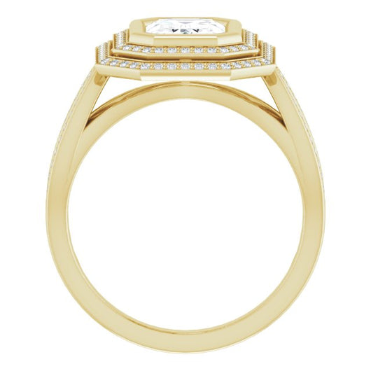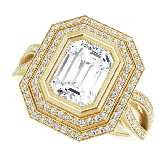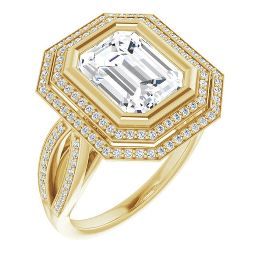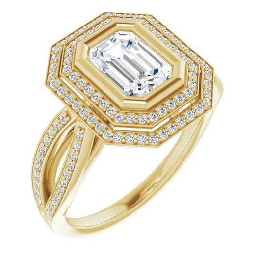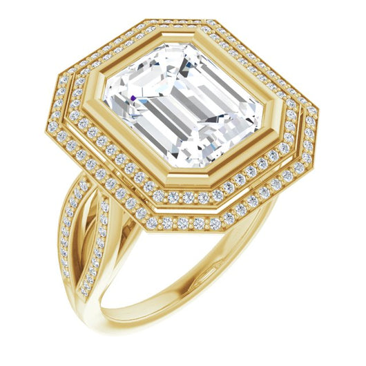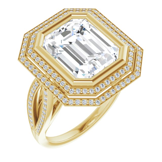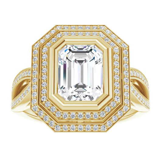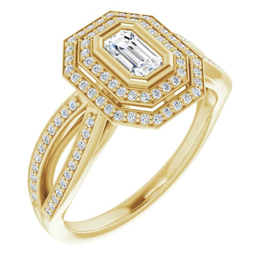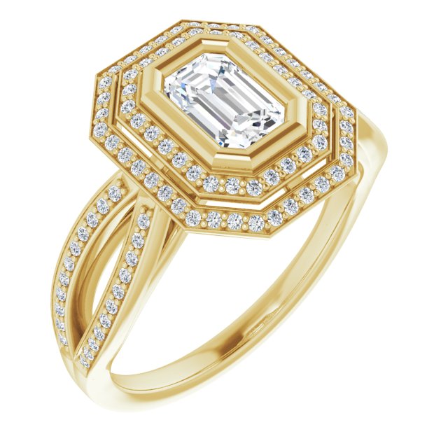 10K Yellow Gold Customizable Bezel-set Emerald/Radiant Cut Style with Double Halo and Split Shared Prong Band