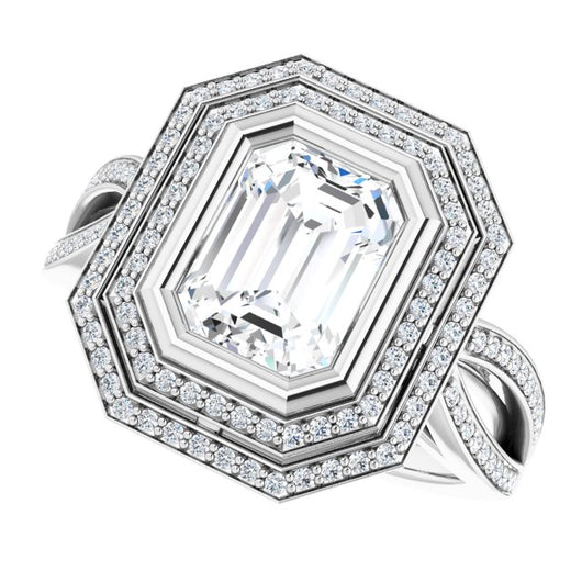 Cubic Zirconia Engagement Ring- The Eliana (Customizable Bezel-set Emerald Cut Style with Double Halo and Split Shared Prong Band)