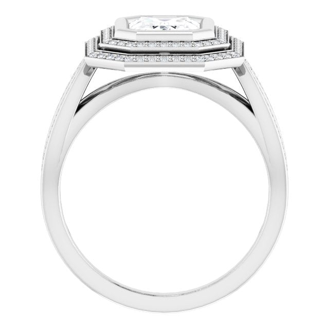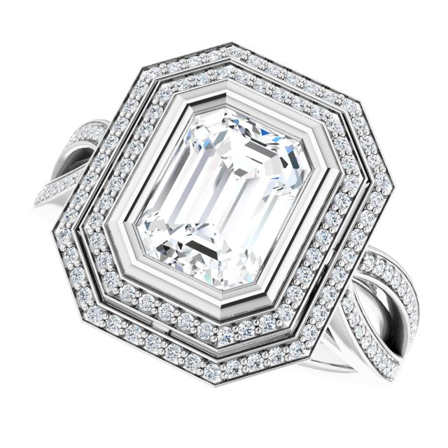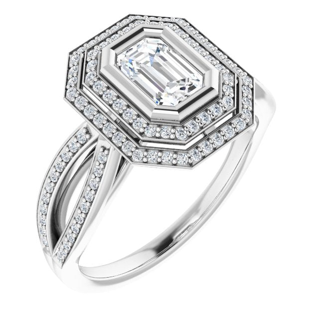 10K White Gold Customizable Bezel-set Emerald/Radiant Cut Style with Double Halo and Split Shared Prong Band