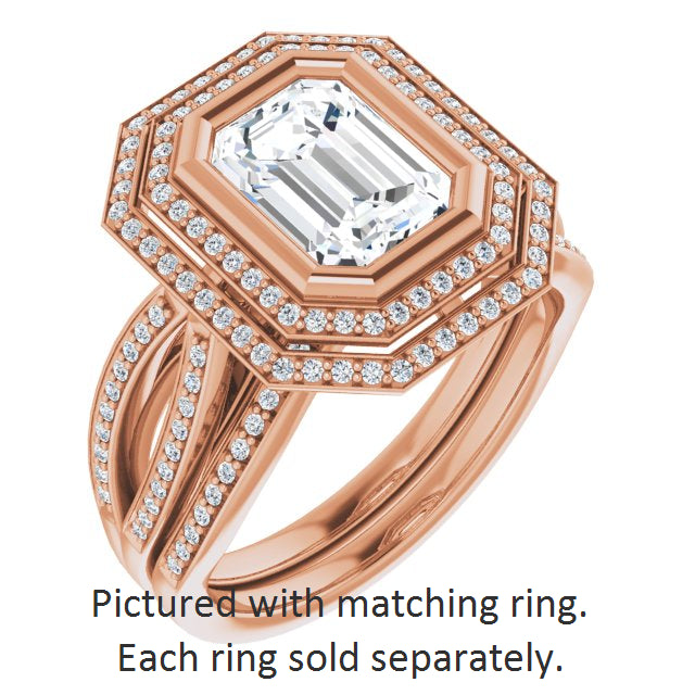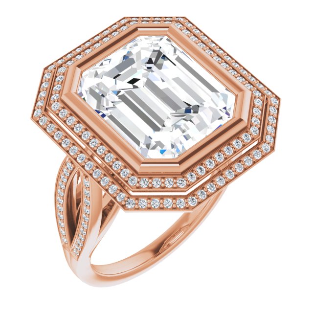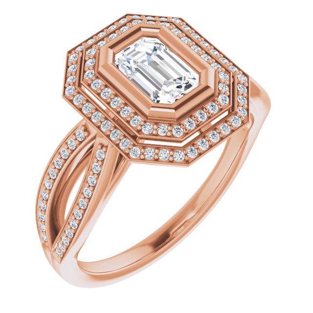 10K Rose Gold Customizable Bezel-set Emerald/Radiant Cut Style with Double Halo and Split Shared Prong Band