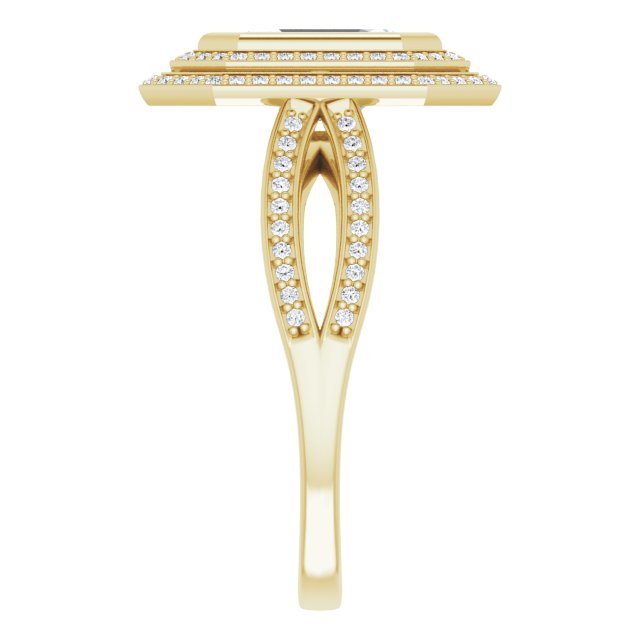 10K Yellow Gold Customizable Bezel-set Emerald/Radiant Cut Style with Double Halo and Split Shared Prong Band