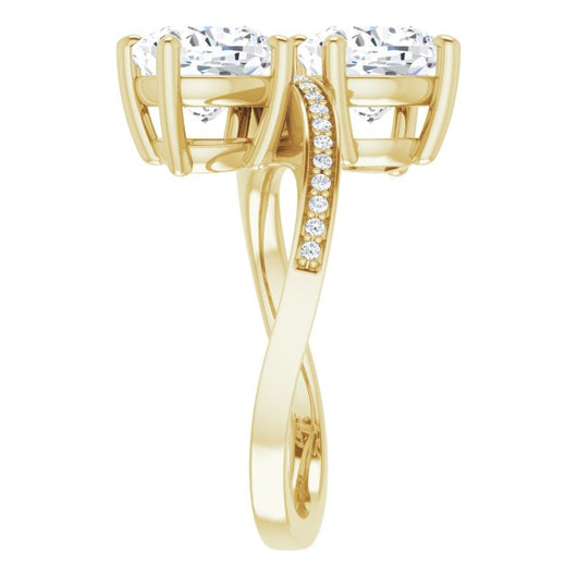 * Your ring’s total carat weight (TCW), band width, weight in grams, and/or number and size of accent, pavé, or halo stones will vary up or down depending on your choice of customizable center stone shape and size, precious metal type, and finger ring size via the drop-down options provided.