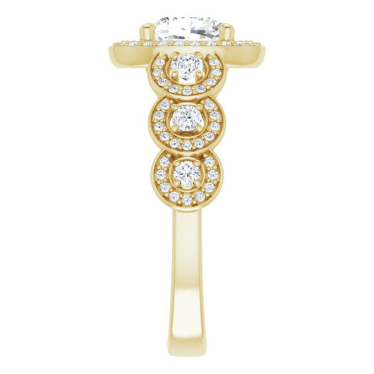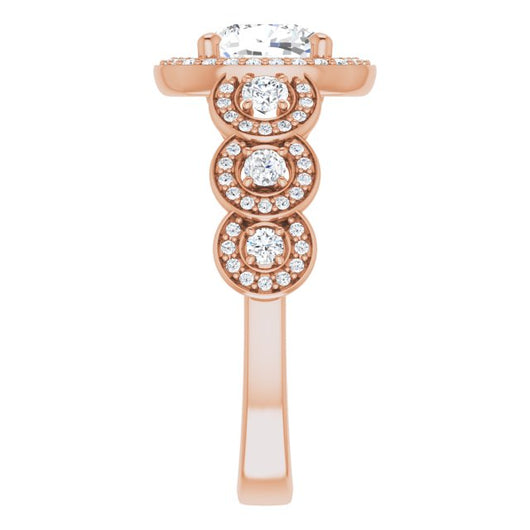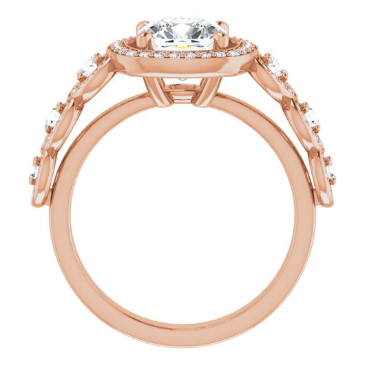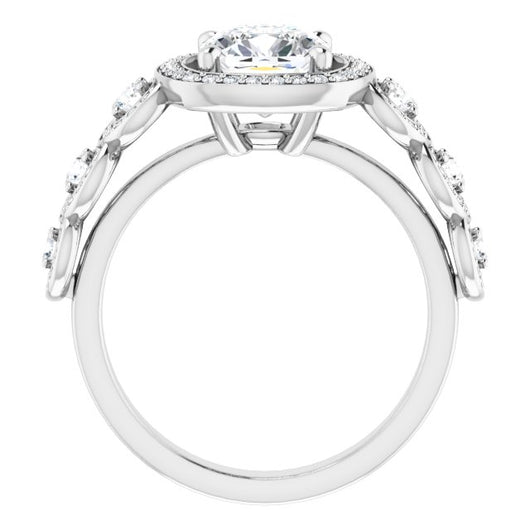 * Your ring’s total carat weight (TCW), band width, weight in grams, and/or number and size of accent, pavé, or halo stones will vary up or down depending on your choice of customizable center stone shape and size, precious metal type, and finger ring size via the drop-down options provided.