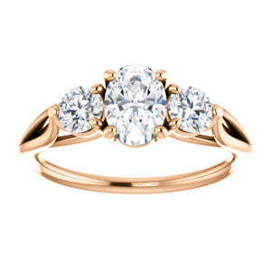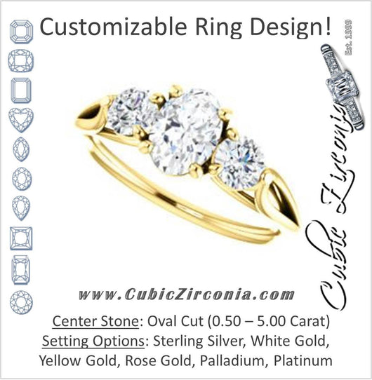 Seal your everlasting commitment to love and cherish the woman of your dreams by presenting this stunning 3-stone customizable engagement ring, with two flanking round cut accents one each to either side of the primary center stone. The Estefi is available as pictured and priced on this product webpage with an Oval Cut center setting of your choice from 0.50 to 5.0 carats, or click the “customize setting” link to see and purchase this ring set with any of 10 total center stone shapes. A tapered-width split band curves down and around from the center setting, and will be manufactured from your choice of 12 precious metals.  Get The Estefi engagement ring as a stand-alone or together with the matching anniversary band to complete the cubic zirconia bridal set!